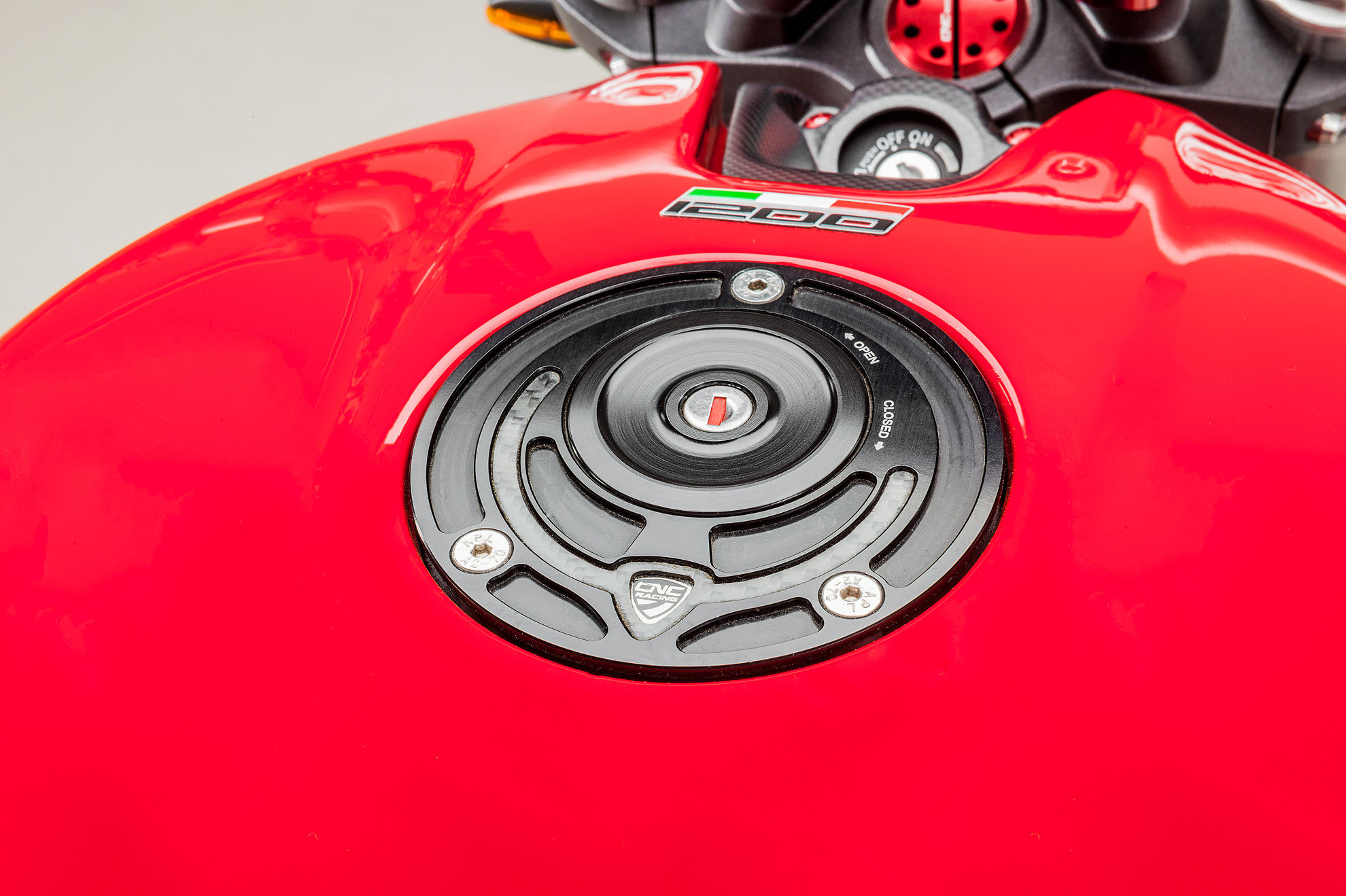 Fuel tank cap CNC machined from light alloy billet and then given a coloured anodized surface finish. Notable for its exclusive race-style design, ergal and carbon weave together to create a unique and top quality product.
